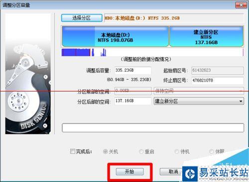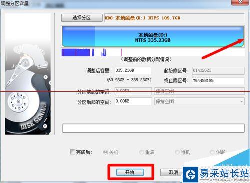 7、從打開的“調整分區容量”窗口中,根據實際使用情況進行合理的分配,點擊“開始”按鈕即可自動分割兩個分區操作。