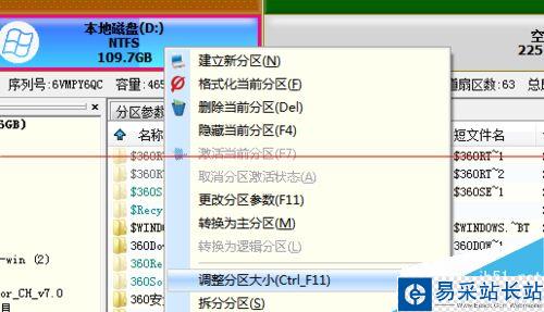 3、接著右擊與已刪除分區相鄰的其它分區,從彈出的右鍵菜單中選擇“調整分區大小”項。