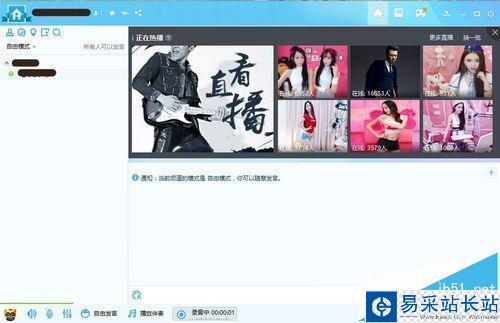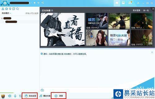 5、但是我們的音樂能讓別人聽到我們唱歌別人卻聽不到,我們點擊頁面最下面的“自由發言”,就可以讓我們說的話讓別人聽到了。然后點擊旁邊的“錄音”就能開始錄了。