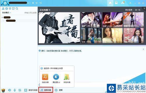 2、我們在頻道的下方找到“選擇伴奏”,點擊之后我們可以選擇這三種當中的一個點擊。