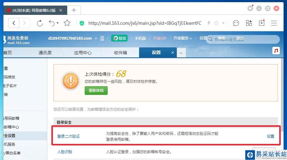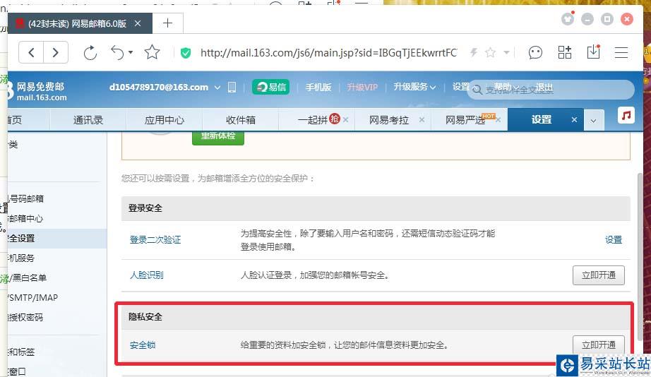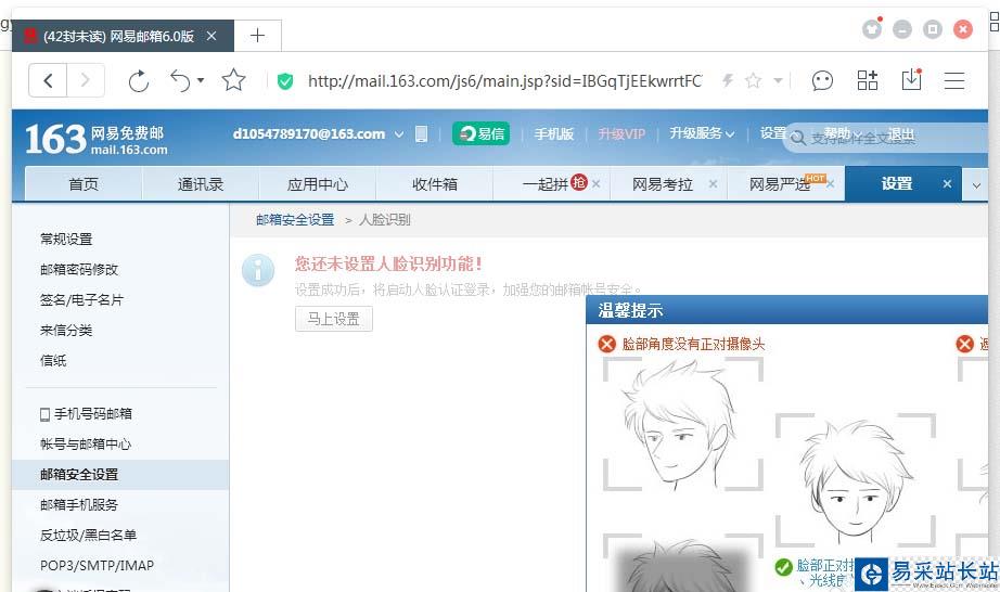 點擊設置——郵箱安全設置——人臉識別——馬上開通;調整攝像頭驗證——完成。如圖: