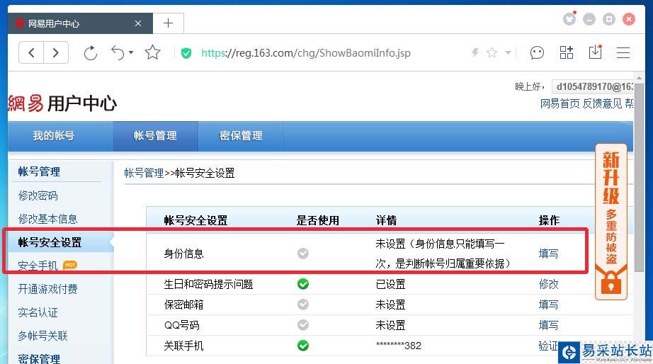 進入賬號管理中心——賬號安全設置——填寫身份信息——發送短信獲取驗證碼——輸入身份證實名+號碼,完成綁定;如圖:一個身份證只能綁定一個郵箱。