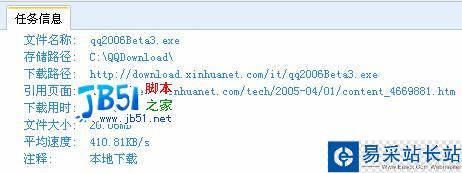 對于下載qq2006Beta3.exe這個軟件,在兩個下載軟件的任務信息里都可以看到下載的一些詳細信息,通過圖2和圖3可以看到,這兩個下載軟件的下載速度和其他信息。