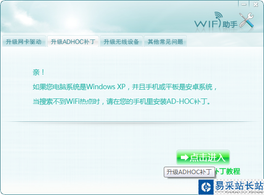 3、如果是XP系統的電腦,無法啟動時候點擊wifi助手選擇安裝ADHOC補丁來嘗試解決問題。
