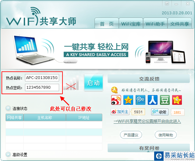 2、軟件名稱是叫wifi共享大師,安裝完畢后打開軟件。軟件首頁有個熱點名稱及密碼的欄,這里是軟件默認的wifi賬號及密碼,我們可以自己修改。