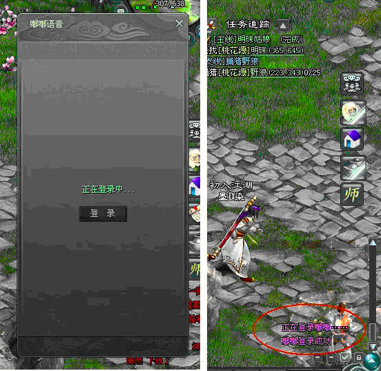 點擊這個“小章魚”圖標(biāo)后,就會出現(xiàn)嘟嘟語音的登陸界面,同時游戲窗口右下角“系統(tǒng)信息”中會顯示嘟嘟語音登陸信息。(如圖)