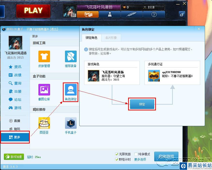 3.點擊盒子左下方的“更多”按鈕,在打開的界面中點擊“角色綁定”,然后根據提示綁定。