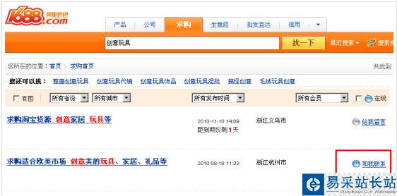 打開阿里巴巴首頁,查看"求購"信息,在中間搜索框里輸入您公司對應的產品名,例如"創意玩具":