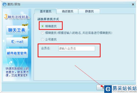 在新彈出的窗口,使用"精確查找"功能,輸入對方的ID(用戶名)來查找并且添加好友