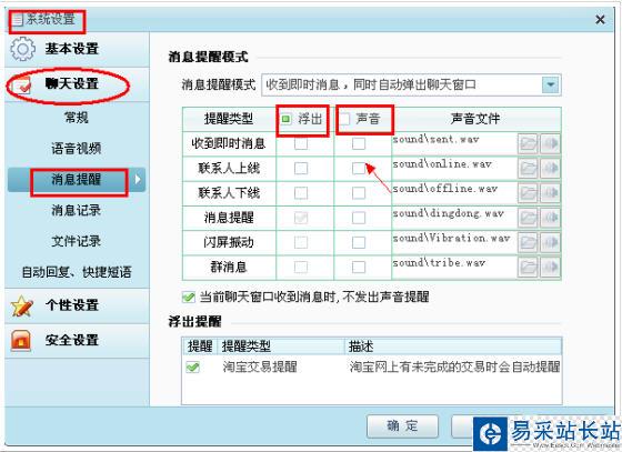 2 、在下拉窗口中,選擇"系統設置"--"聊天設置"--"消息提醒",在打開的頁面上,您可以根據自己的需要,針對提醒類型來選擇,看是否需要浮出或者聲音提示,不需要,去掉打勾項即可。