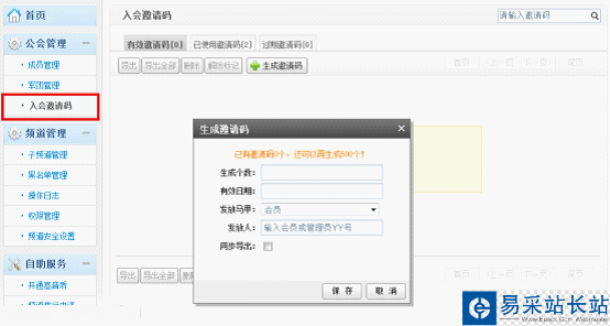 步驟3:點擊“生成邀請碼”填寫生成的個數、有效期、邀請碼類型(會員/嘉賓),點擊“保存”即可