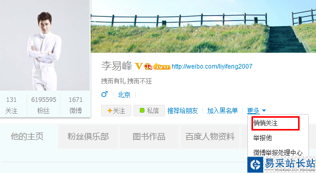 3、用鼠標掃過關注,切記不要直接點關注,而是輕輕的掃動到關注那一欄,右邊則會顯示出悄悄關注這一欄目,只需點擊,便可悄悄關注啦!