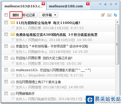 在讀信界面左下角,點擊刪除按鈕,也可將當前郵件刪除。
