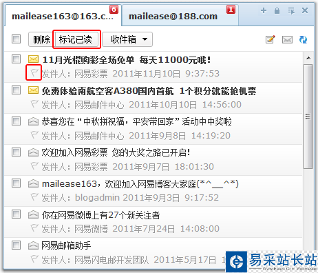 2、顏色標簽:在郵件列表,點擊某封郵件發(fā)信人前面的小旗幟圖標,可將郵件主題標記為紅色/默認顏色。