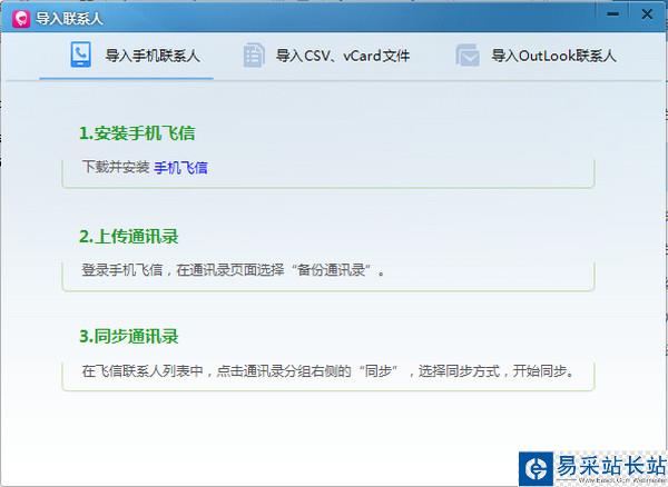 在飛信2014通訊錄的右邊有個導入按鈕,打開之后就可以看到聯系人導入向導,一共三種方式,大家可以按照向導提示進行操作!