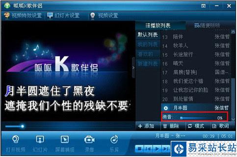 點擊歌曲會出現消音功能,在消音處按鈕滑動到0%時是原唱相反按鈕滑到100%的時候是伴奏,純音樂,用戶可以隨意調節自己想要的音樂效果。下圖: