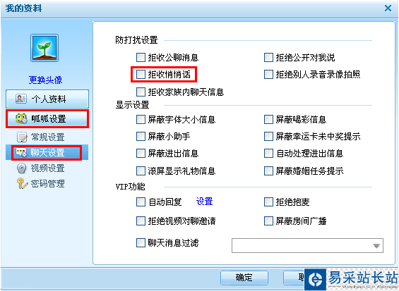 如果您不想接收聊友對你發送悄悄話,您可以在“主菜單”中點擊“個人設置”,然后選擇“拒收悄悄話”,點擊確定即可。下圖: