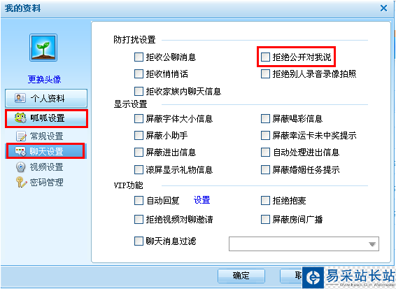 如果不想讓聊友對你公開說話,您可以在“主菜單”中點擊“個人設置”,然后選擇“拒絕公開對我說話”,點擊確定即可。下圖: