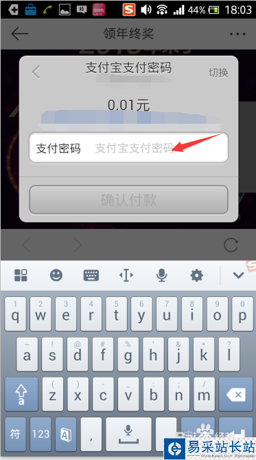 (這個需要綁定了支付寶)輸入自己的支付寶密碼,支付完成即可。小編這里告訴大家,這里支付的1分錢后面會返給你的。具體他活動頁面有介紹,本人是親測有效的。