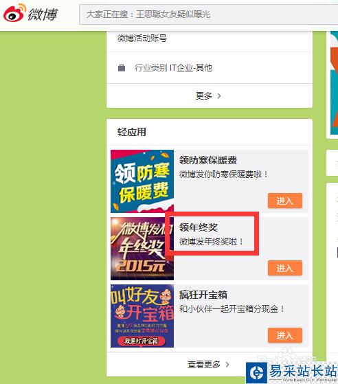 在他的主頁中往下拉,在左邊位置會看到如圖,微博年終獎(兩個費的領取方法是一樣的喲)