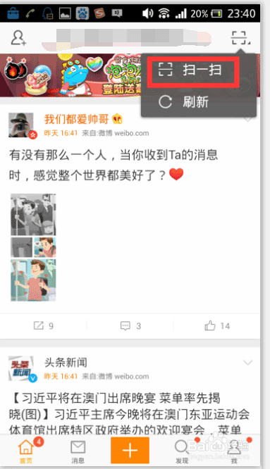 進入自己的客戶端之后,右上角有一個掃一掃標志,點一下找到掃一掃。