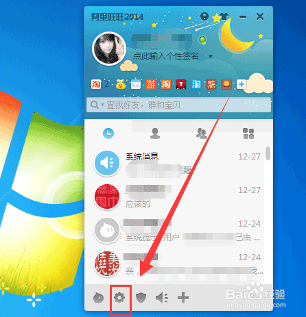 首先,我們打開阿里旺旺軟件,登錄自己的賬號,然后在窗口主界面下方單擊【設置】小按鈕,如下圖所示。