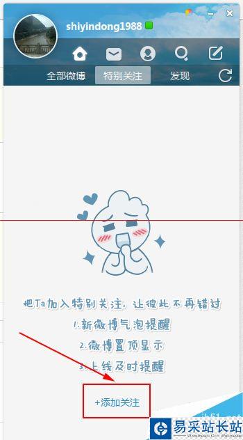 3、在特別關注里邊,小編暫時還沒有關注任何人,可以看到下邊有“添加關注”的選項,點擊進入。