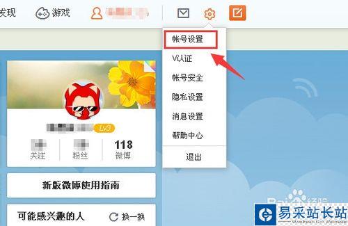 完成登陸來到新浪微博的首頁,再點擊右上角的”設置圖標“,在彈出來的功能選項中,點擊”賬號設置“。(如下圖)