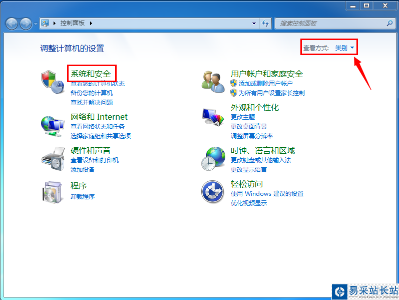 2)打開控制面板后,右上角選擇到類別,再選擇系統和安全。