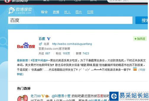 1、登錄新浪微博以后,在網頁的上中部有個搜索的小圖標。如果你有你朋友的微博名字,這里是直接搜索的最佳地點。比如我搜百度,這里就會出現下面的展示圖: