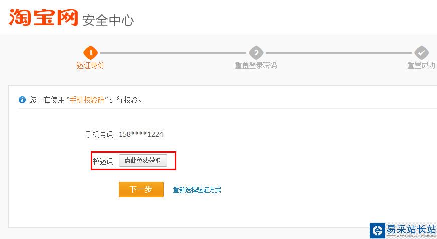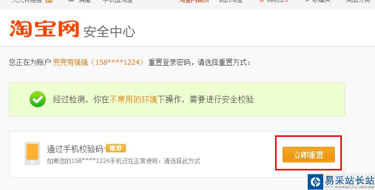 3、讓后我們就會(huì)進(jìn)入淘寶的安全中心,我們選擇通過手機(jī)效驗(yàn)==點(diǎn)擊“立即重置”