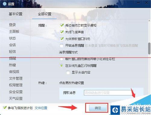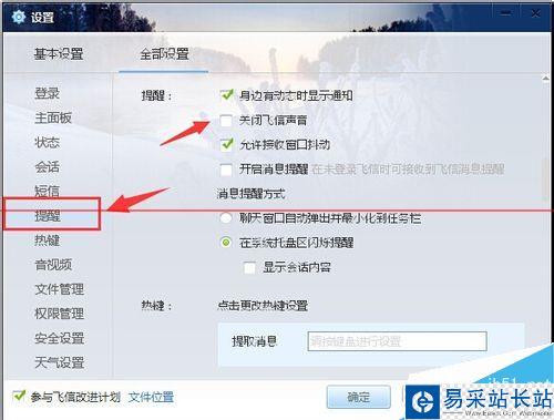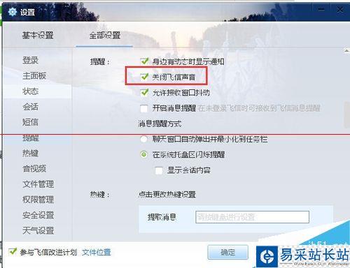 6、來到全部設置的登陸設置頁面,再點擊左側列表中的”提醒“菜單,然后就可以看到右側”關閉飛信聲音“前面的方框是空白的,然后用鼠標點擊方框進行選中勾上,再點擊右下角的”應用“按鈕,最后再點擊”確定“就可以了。(如下圖)