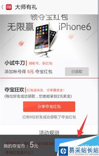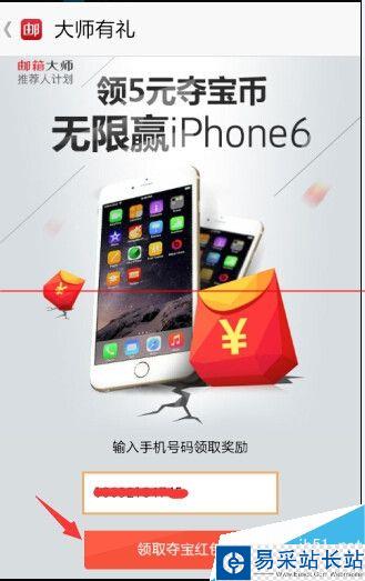 3、接著來到大師有禮頁面,在下面輸入自己的手機(jī)號碼,然后點(diǎn)擊“領(lǐng)取奪寶紅包”按鈕。(如下圖)
