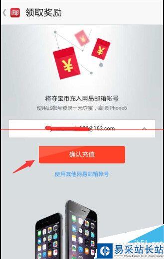 8、來到郵箱大師領(lǐng)取獎勵頁面,在選擇框中選擇需要充值奪寶幣的其中一個網(wǎng)易郵箱,然后點(diǎn)擊“確認(rèn)充值”。(如下圖)