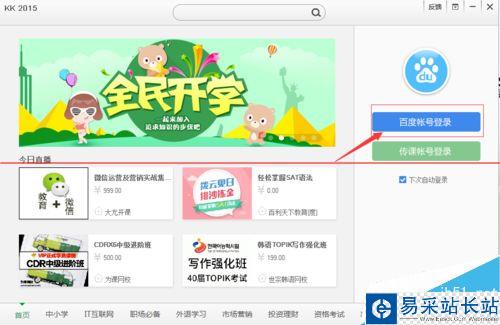 2、打開百度傳課KK客戶端,登錄自己的百度傳課賬號,如果有百度傳課賬號,就有百度傳課賬號登錄,也可以用百度賬號登錄。