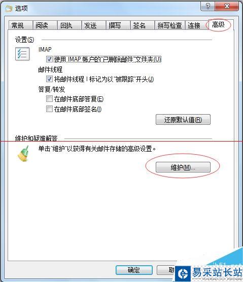 3、在選項對話框中,點擊“高級”,跳到“高級”頁簽,點擊“維護”按鈕,如下圖中標紅的框,彈出了維護的對話框。