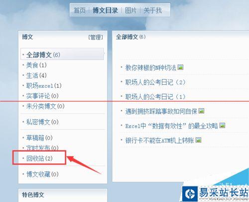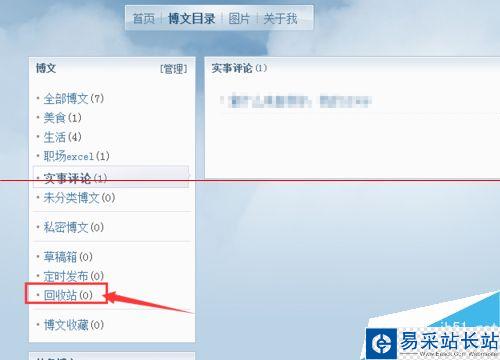 4、在博文目錄的左側你可以看到“回收站”的選項,這就是不能徹底刪除的根源所在。