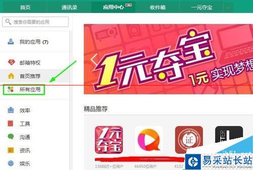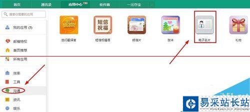 2、點(diǎn)擊該項(xiàng)以后,就會(huì)切換到郵箱的應(yīng)用列表里,如圖;我們點(diǎn)擊分類(lèi)列表下的"溝通",然后就會(huì)看到"電子名片"這一選項(xiàng)了