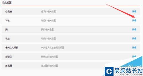 4、展開消息設置這一選項后,我們可以點擊評論后邊的編輯