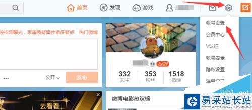 2、然后點擊微博頁面右上角如圖所示的圖標,選擇賬號設置