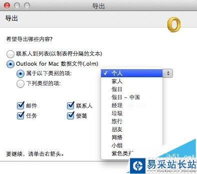 2、選擇需要導出的內容。 點選『聯系人到列表』;outlook for mac數據文件(.olm),點選『屬于以下類別的項』:在右邊的列表中選擇分類;點選『下列類型的項』:勾選下面的復選框(如:郵件,聯系人,日歷,任務,便箋)。選擇完成后,單擊右下角的『右剪頭』。