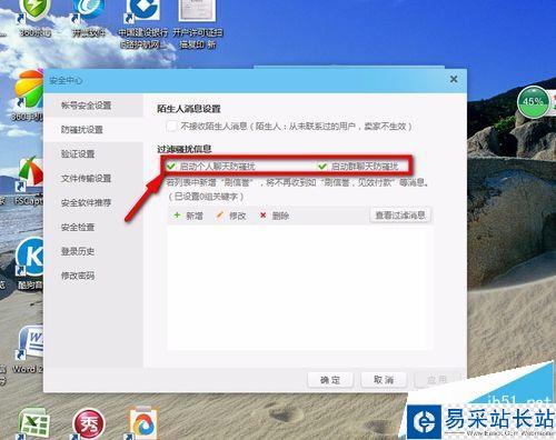 4、然后我們看到第二項有個“過濾騷擾信息”的設置,我們把下方的“啟動個人聊天騷擾”和“啟動群聊天防騷擾”的前面都打上勾,如下圖所示: