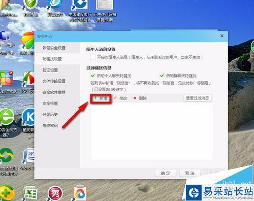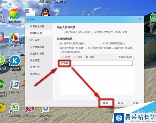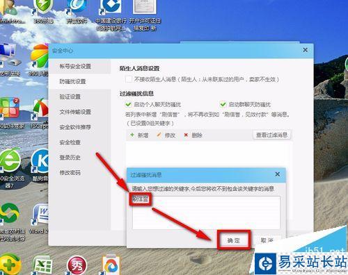 6、然后會彈出來一個對話框,我們在中間的“過濾騷擾消息”的文字框內輸入我們想過濾消息的關鍵詞,然后點擊確定,如下圖所示: