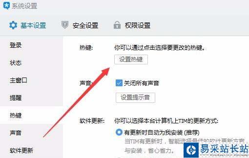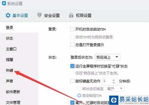 1、我們可以設置TIM提取消息的熱鍵,這樣就可以快速打開TIM的消息,或是打開TIM的主界面,在打開的TIM系統設置窗口中,點擊左側邊欄的“熱鍵”菜單項。