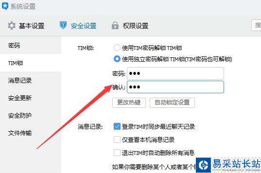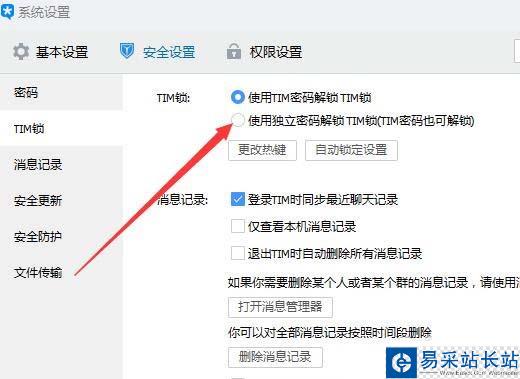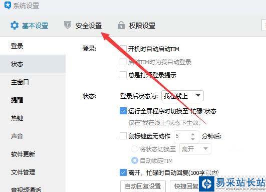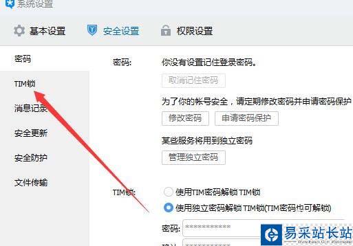 6、默認情況下在解鎖的時候需要輸入TIM的登錄密碼,其實我們也可以設置一個簡單的TIM解鎖密碼就可以了。 只需要在打開的TIM系統設置窗口中點擊上面的“安全設置”標簽。