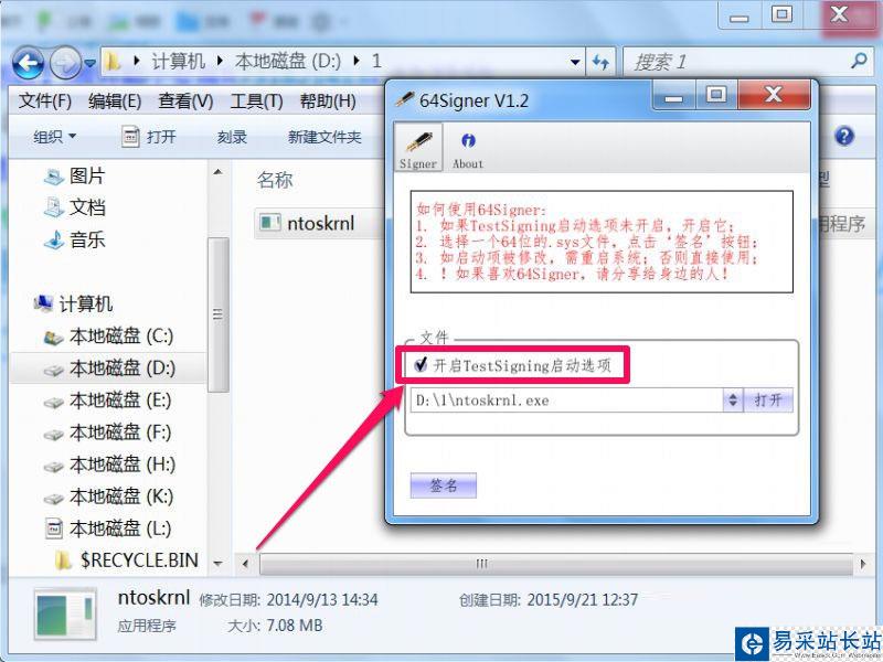 5、簽名成功后,會(huì)彈出“ntoskrnl.exe has been signed with 64Signer test certification”這樣的提示,如下圖。