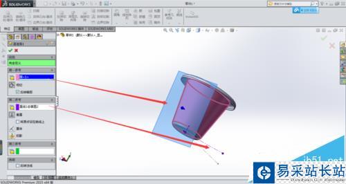 2、點(diǎn)擊旋轉(zhuǎn)凸臺命令,對草圖輪廓進(jìn)行旋轉(zhuǎn),以草圖中心線為旋轉(zhuǎn)軸生成實(shí)體。再次進(jìn)入草圖,繪制一條直線,指定角度和草圖1中的的角度對應(yīng),使直線垂直于垃圾筒斜面。完成后創(chuàng)建一個(gè)新的基準(zhǔn)平面,分別選擇斜面和剛剛繪制的直線作參考,如圖所示