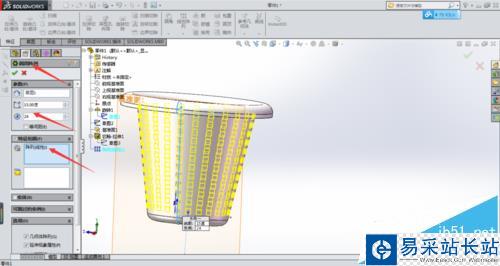 3、選擇剛剛創(chuàng)建的基準(zhǔn)平面繪制草圖,通過拉伸切除命令產(chǎn)生垃圾筒側(cè)面的孔。接著選擇線性陣列,使該孔沿斜面均勻陣列。