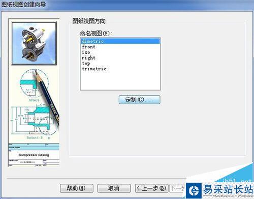 4、在“圖紙視圖方向”界面選擇一個視圖,點擊“定制”,彈出“定制方向”對話框,確定視圖方向后關閉該對話框,在“圖紙視圖創建向導”對話框中點擊“完成”,如下圖所示: