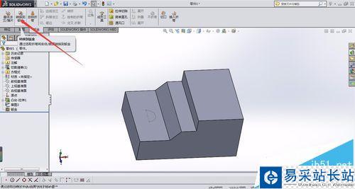 1、這里隨意畫一個臺階實體,并創建一個切口草圖,完成以后使用轉換鈑金命令。